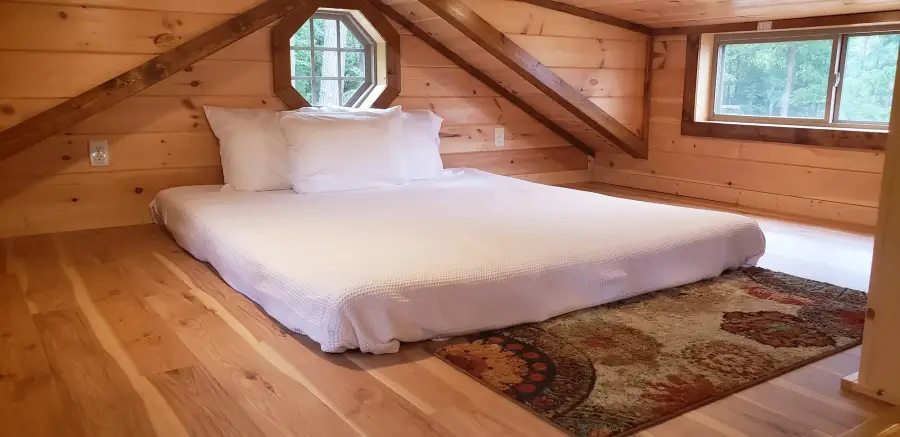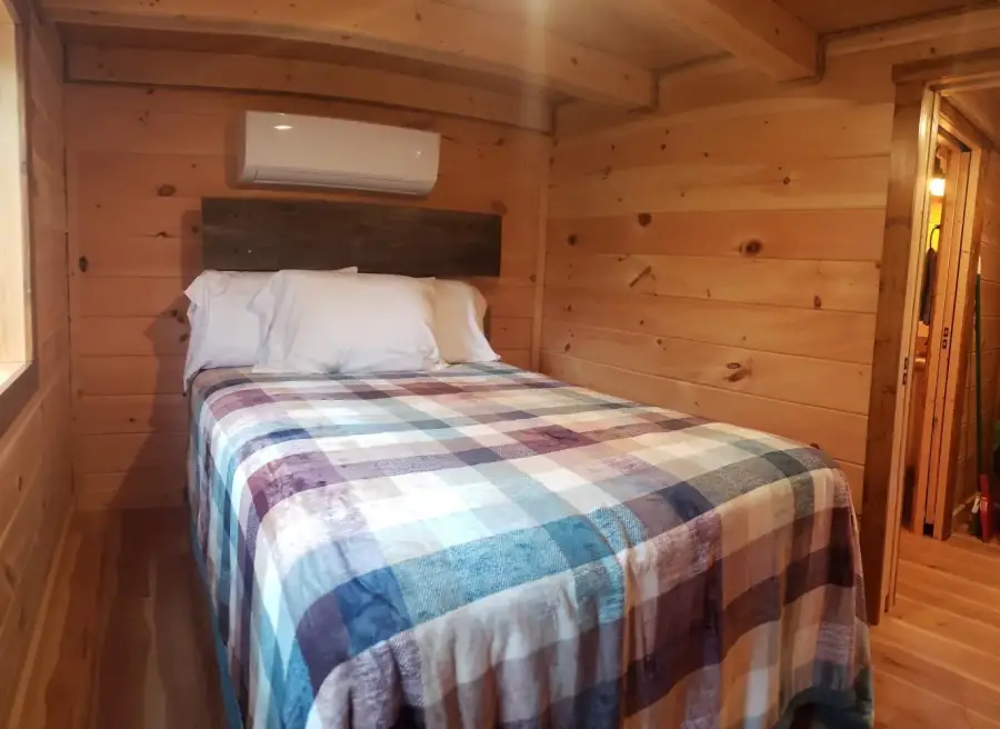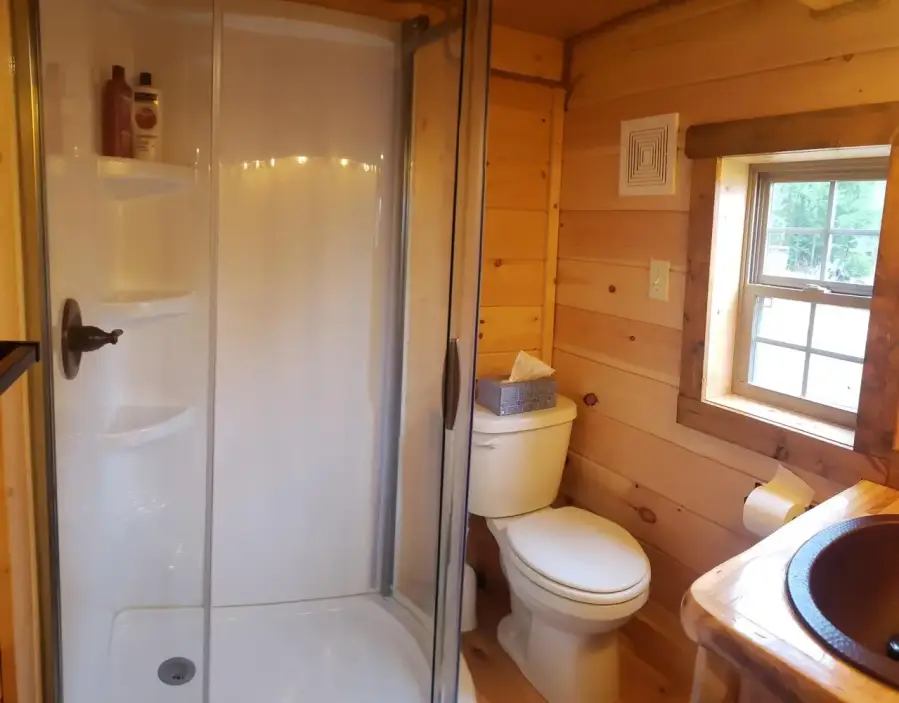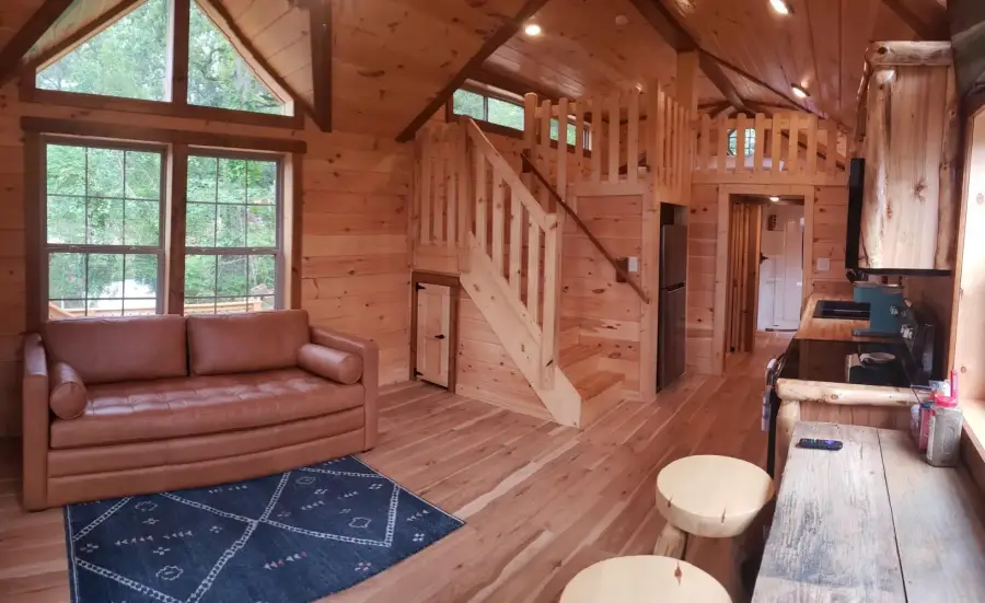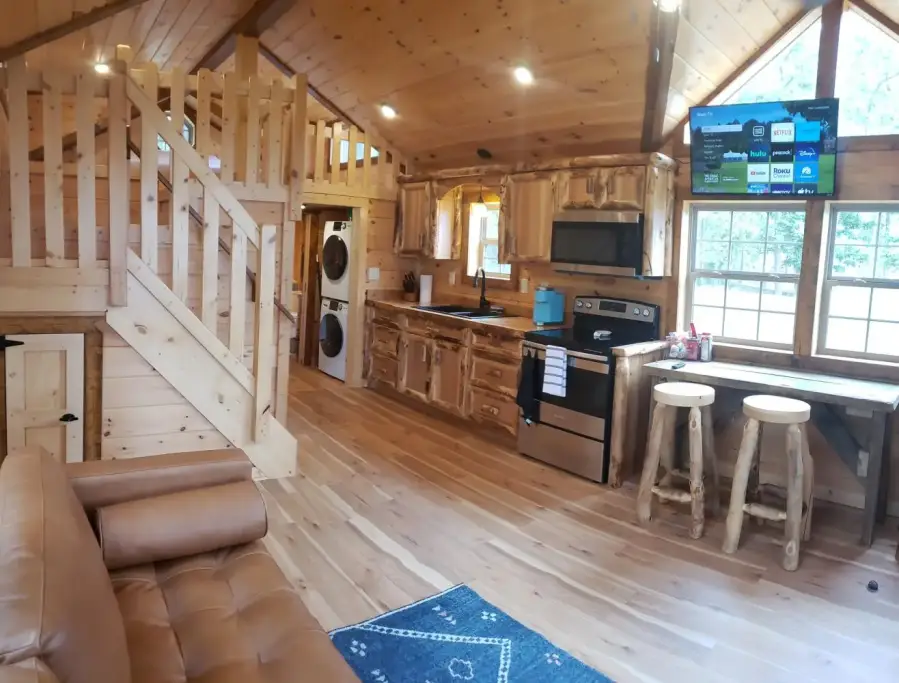 Tiny Toledo offers comfortable accommodations with a full-sized bed in the bedroom, a king-sized bed in the upstairs loft, and a queen-sized sleeper sofa in the living room. The cabin's bathroom features a single lavatory and a stand-up shower. The combined living room, kitchen, and dining area provides all the comforts of home, including a refrigerator, oven, stove, and microwave. A convenient stackable washer and dryer are also provided. The all-wood interior with walnut accents creates a warm and inviting rustic lakehouse atmosphere.